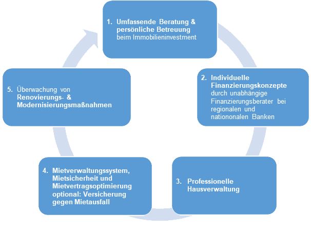Mit unserem exklusiven Service bieten wir unseren Kunden einen kompetenten und umfassenden Service rund um den Immobilien- kauf sowie die Haus- und Mietverwaltung. Denn um eine Investition muss man sich kümmern, um ihren Wert nicht nur zu halten, sondern auch strategisch langfristig zu steigern. Wir schalten uns von Anfang an ein, von der Objekt und Standortprüfung in der Erwerbsphase, über die Vorbereitung aller notwendigen Verträge und die Begleitung in der Finanzierungsphase bis hin zum Bereitstellen aller objektbezogenen Beleihungsunterlagen sowie der persönlichen und individuellen Beratung während des gesamten Erwerbsprozesses. Nach dem Kauf übernehmen wir für unsere privaten Kapitalanleger auf Wunsch auch noch die Vermietung und Mietbetreuung, die Vertretung in Eigentümerversammlungen sowie alle weiteren anfallenden Verwaltungsaufgaben. Zusätzlich bieten wir Ihnen eine langfristige Mietabsicherung.